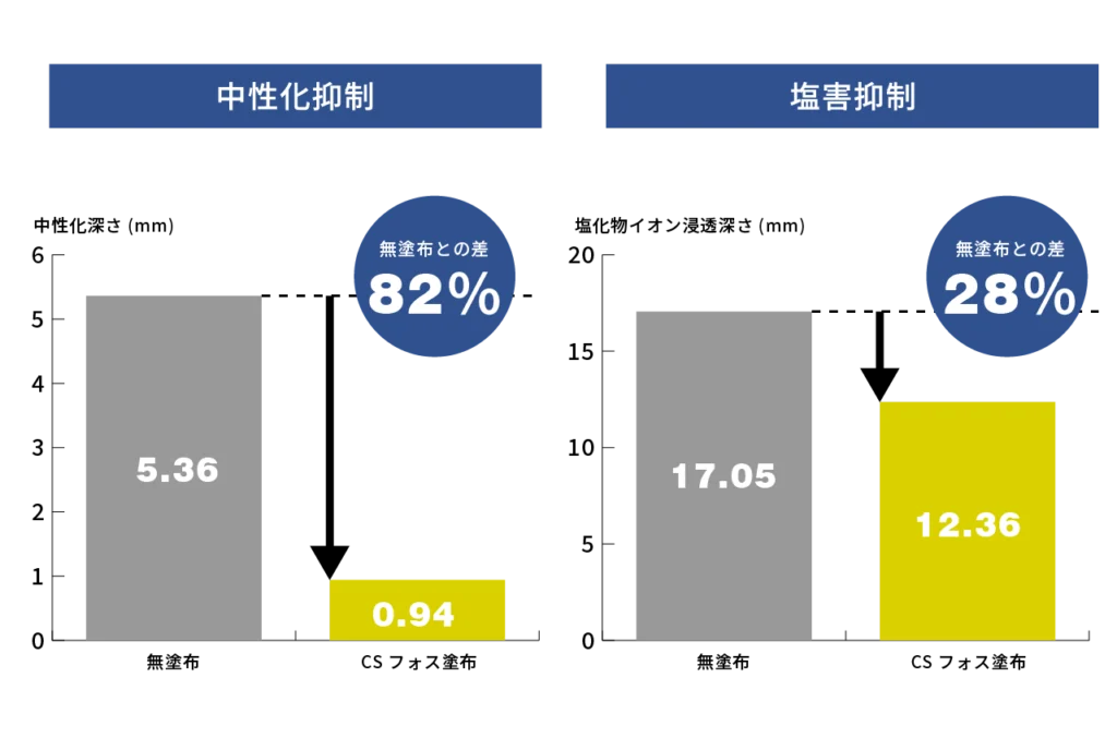 CSフォスは、新設コンクリート構造物の更なる品質向上・耐久性向上を図る表面保護材です。従来のけい酸塩系表面含浸材の特性を生かしつつ、独自のリン酸配合技術により、反応性が向上し、長期にわたり、コンクリートの耐久性を確保します。特に中性化抑制に高い効果が期待できます。